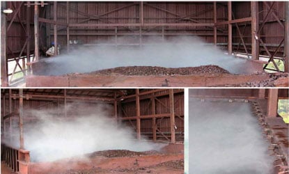 配合浦塔( 开云 )堆场深层抑制剂 SS-300 使用:对于物料内部进行深层抑制,物料堆放前均匀喷洒、混拌;避免了需铲、装、运产生的二次扬尘。可根据浓度调节,抑尘时间可达半年。